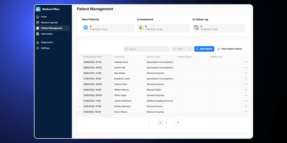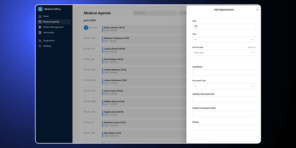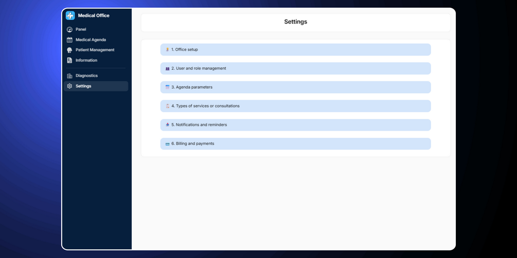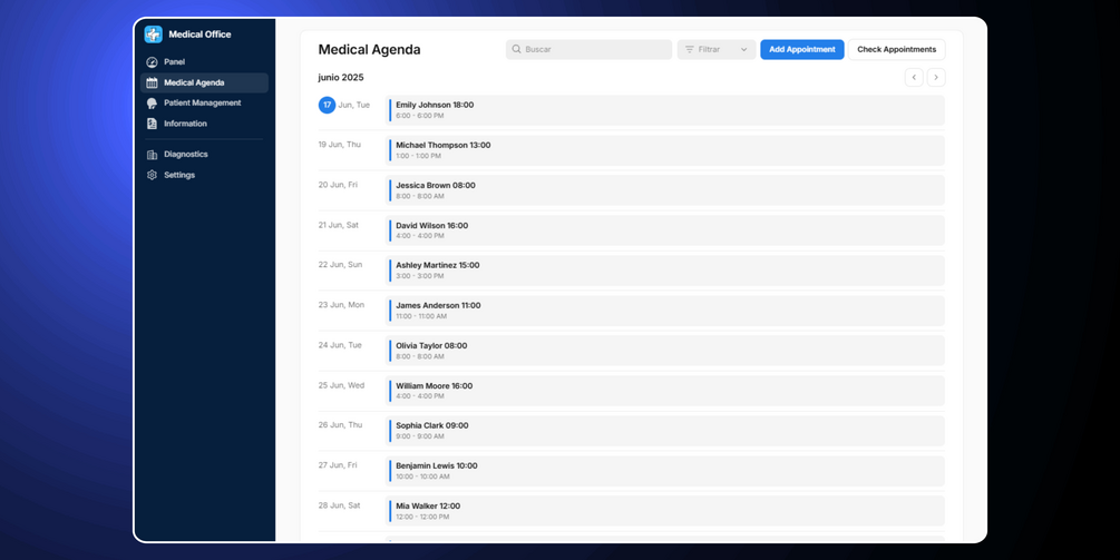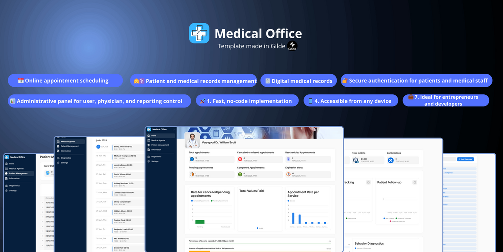 This template is designed for developers or entrepreneurs who want to quickly implement a medical office system without starting from scratch. It is easy to customize, scalable, and ready to integrate with other tools or services.
